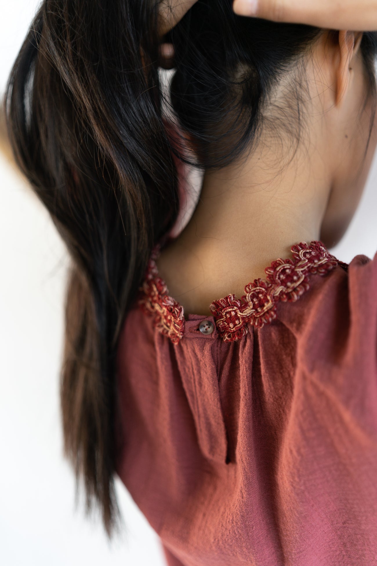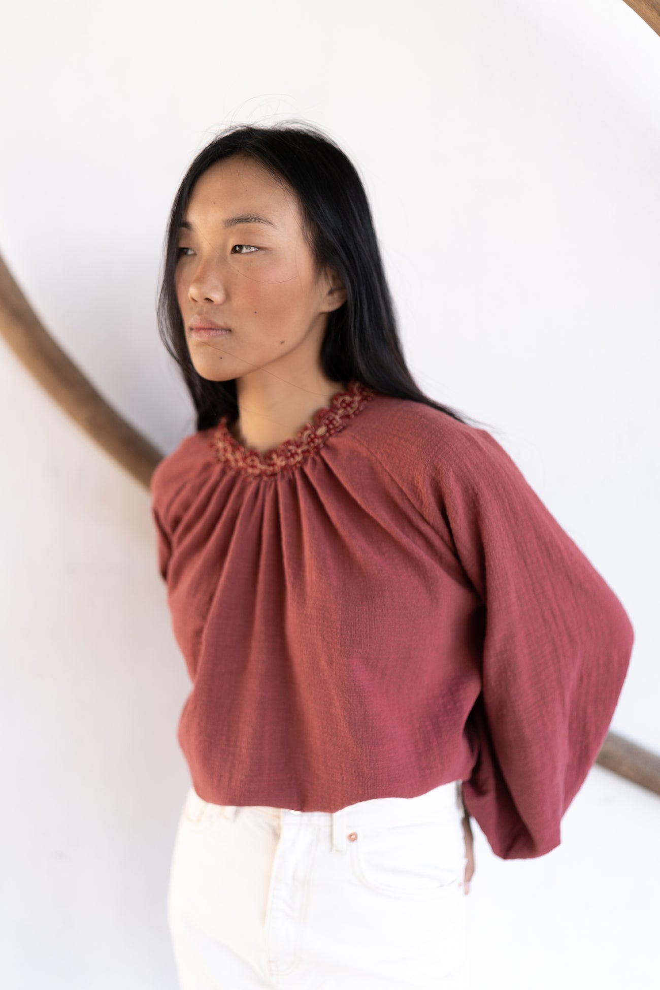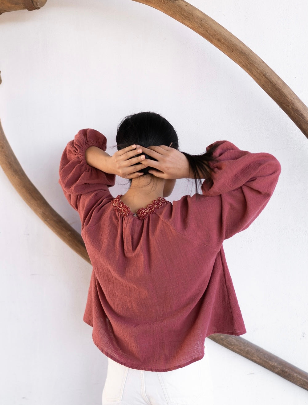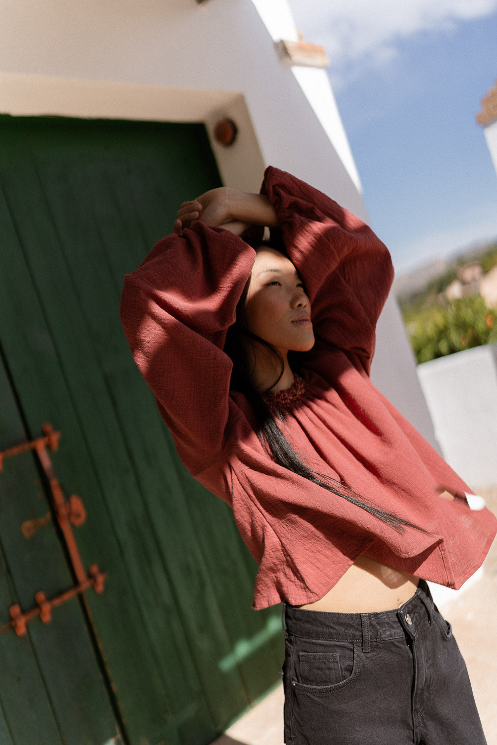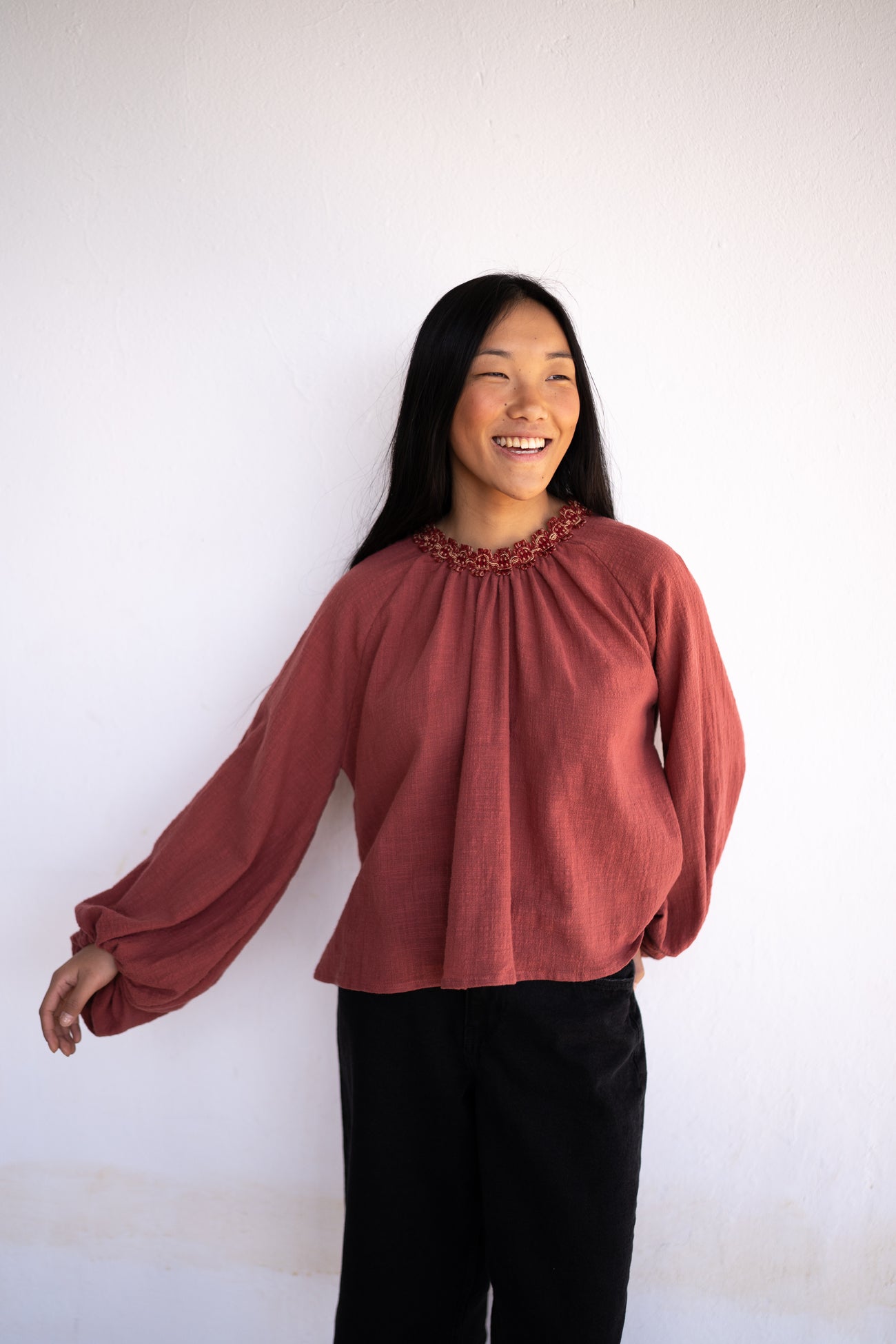 Blusa tejido rústico en color caldera. Fruncida en delantero y trasero con fornitura especial en el escote. Manga farol desigual con goma en el puño.