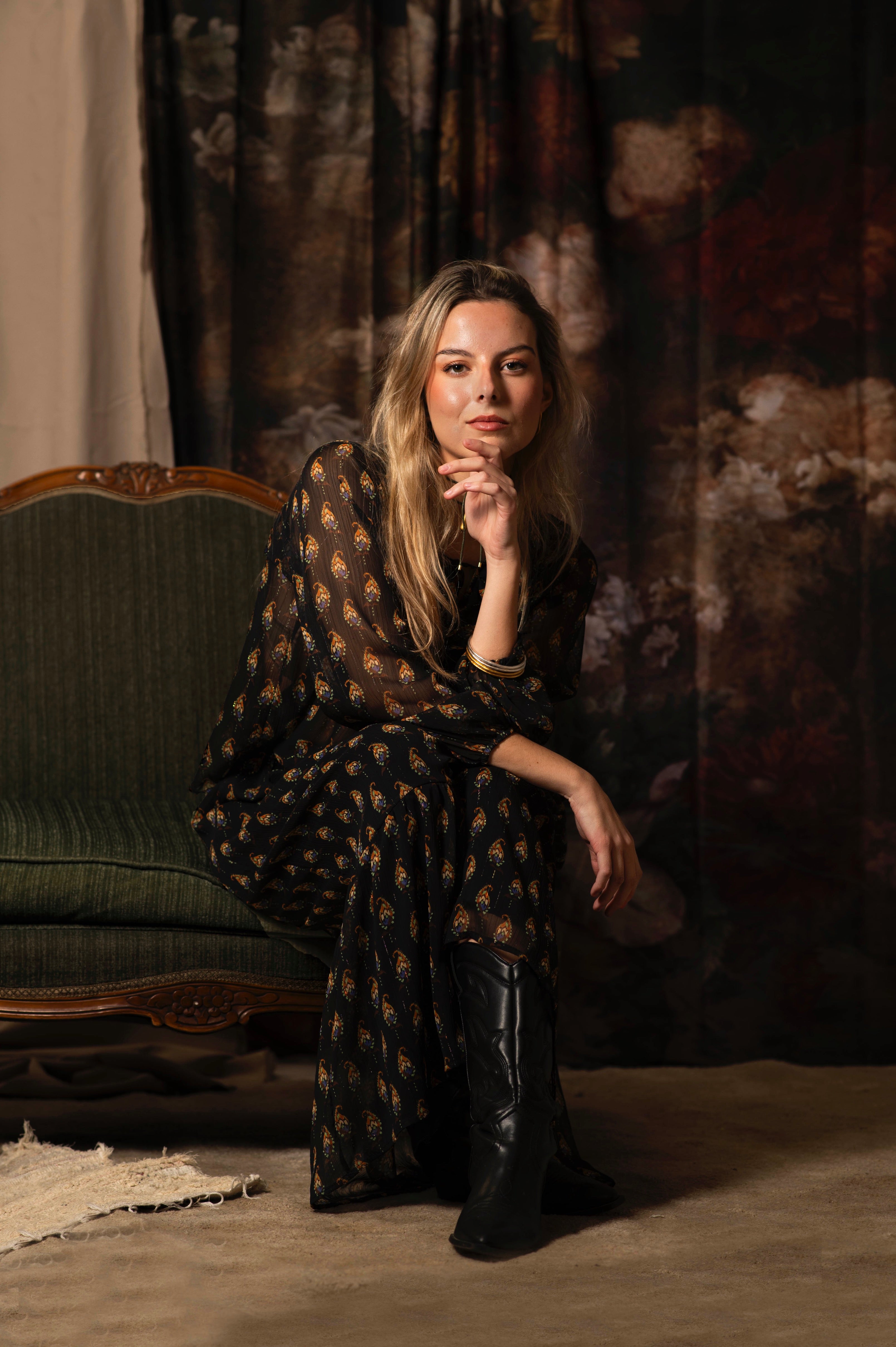 Blusa negra gasa estampado flor india con detalle de raya lurex en dorado. Manga larga con goma en el puño. Escote con volante y cierre con lazada. Volante canesú delantero y trasero.