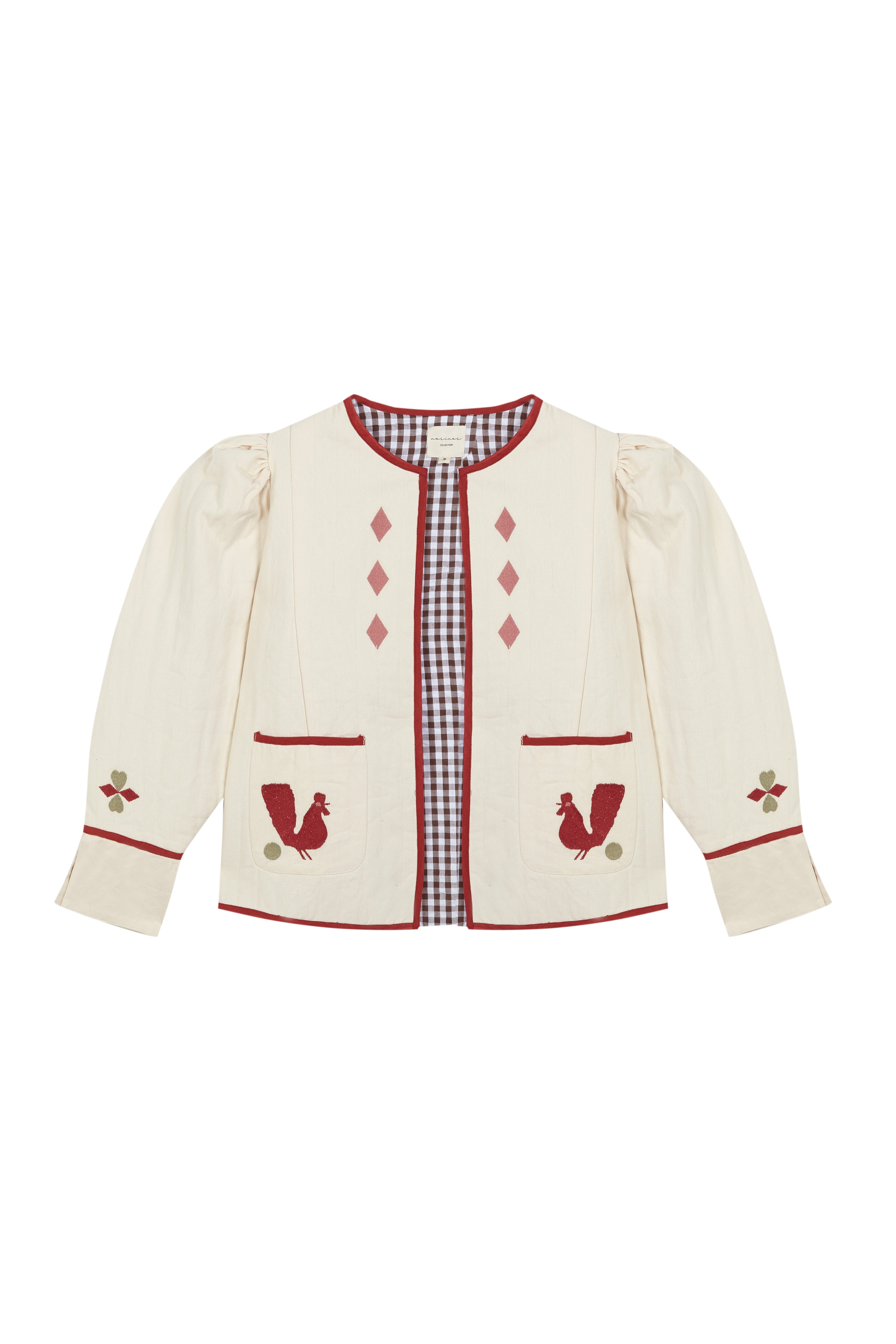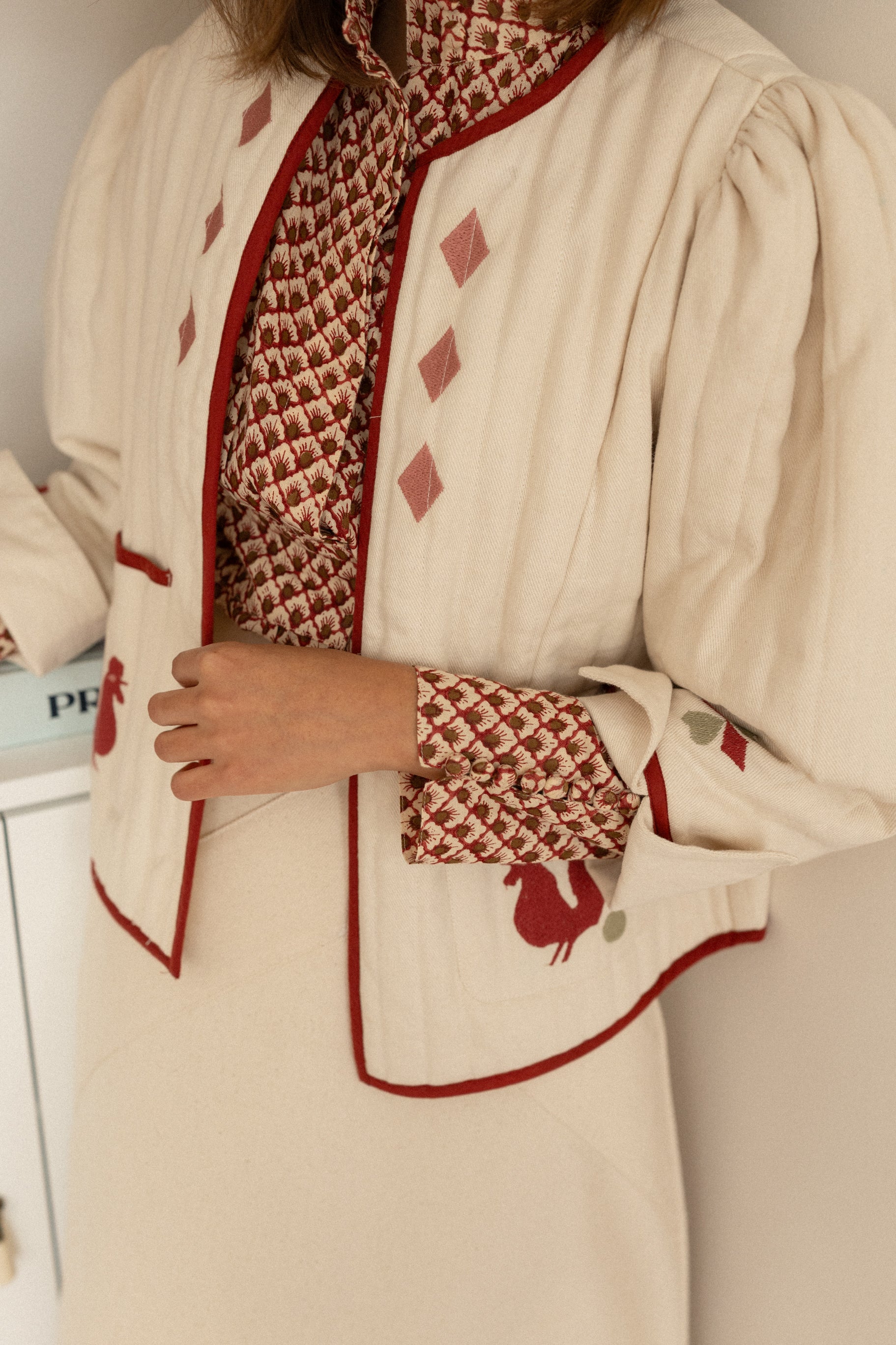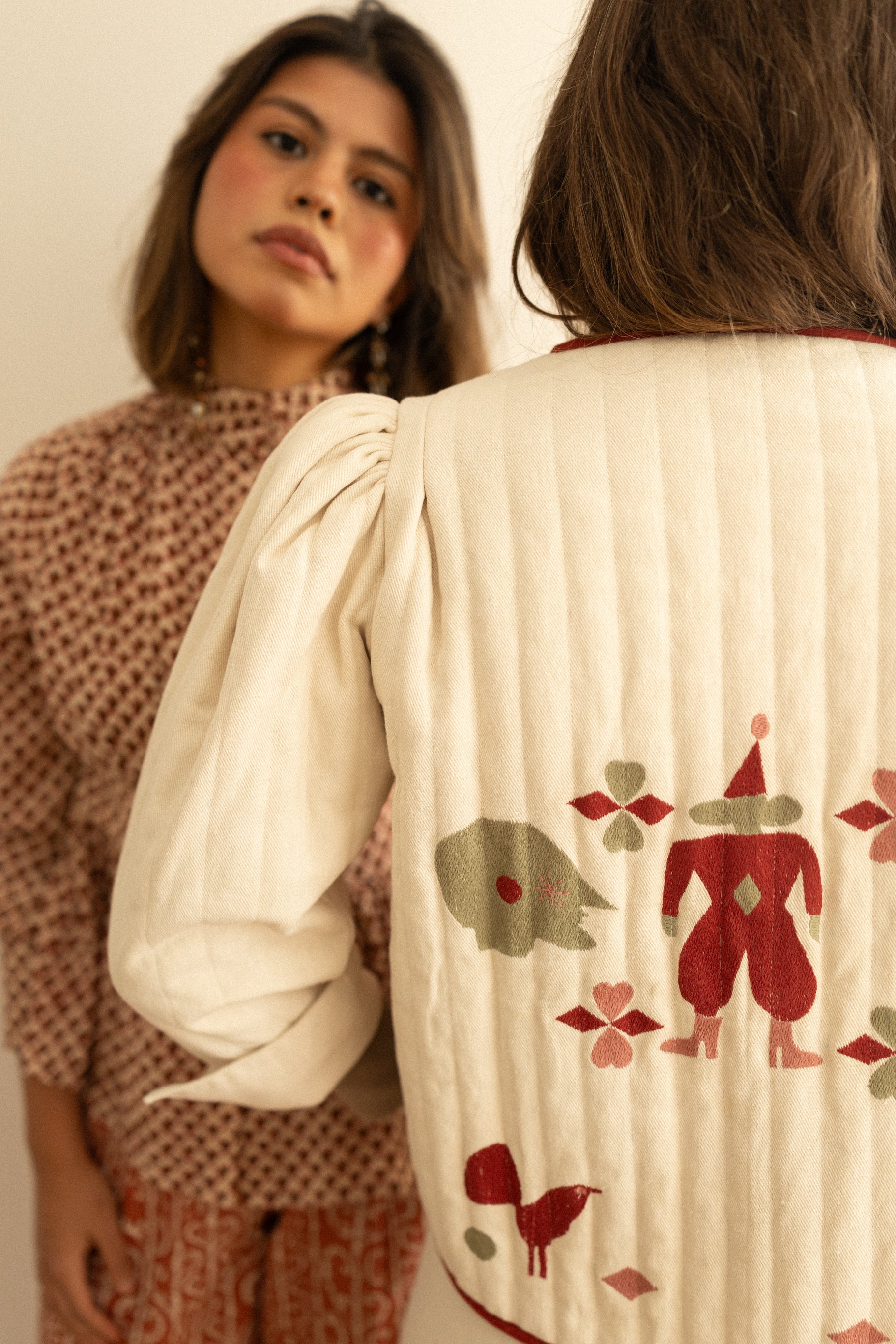Chaqueta acolchada con tejido en 100% algodón con bordados artesanales en tonos teja y verde.