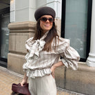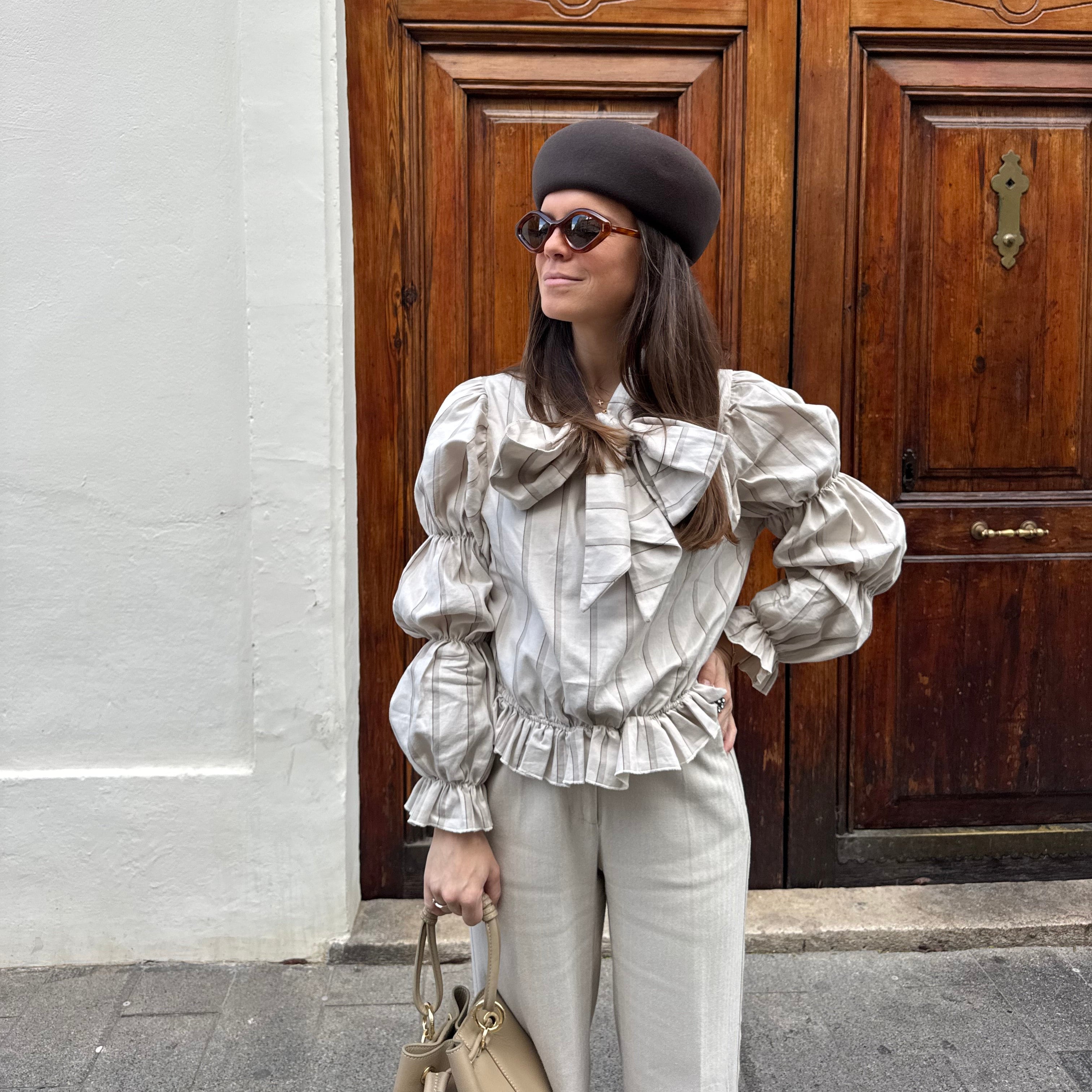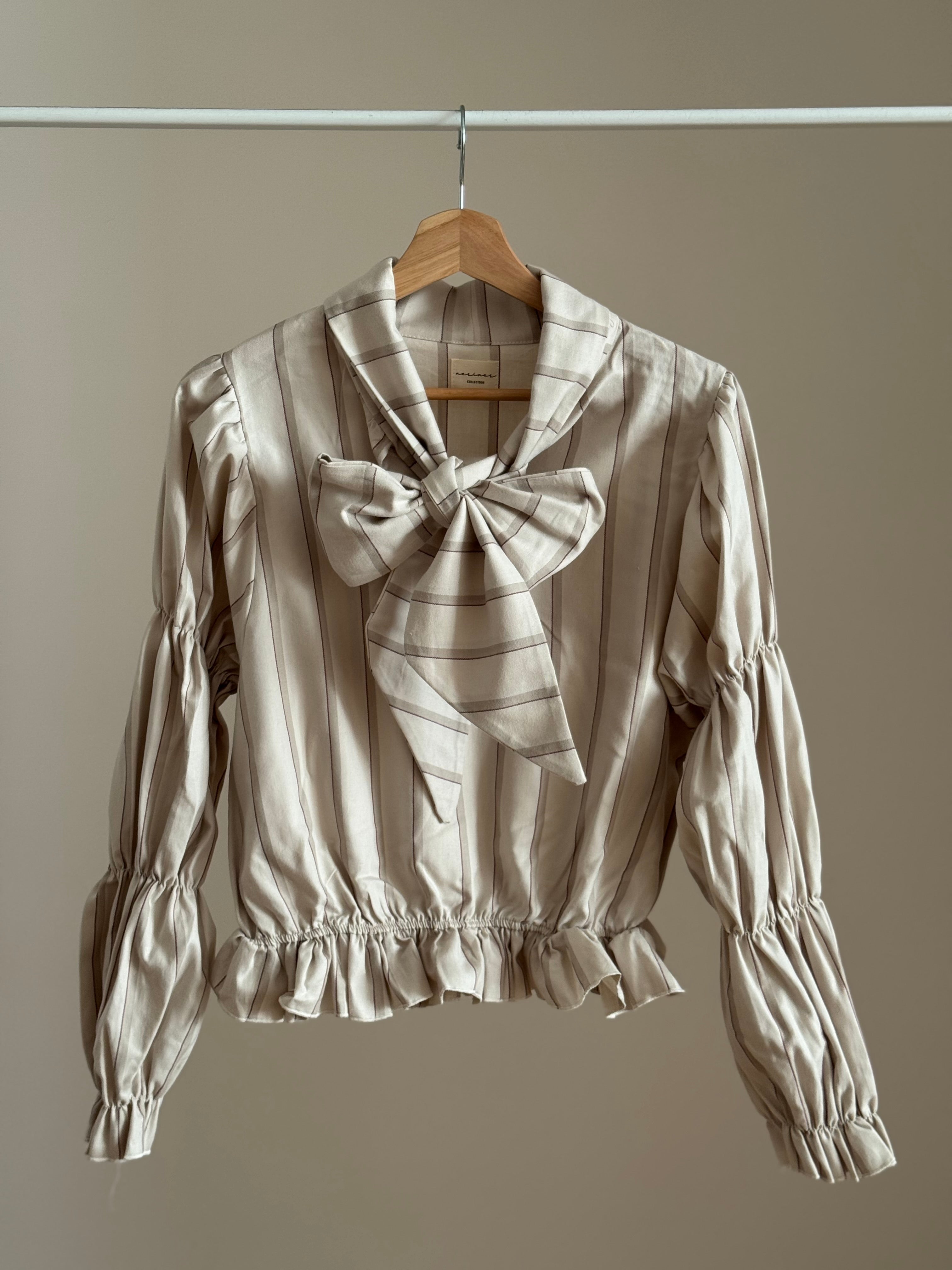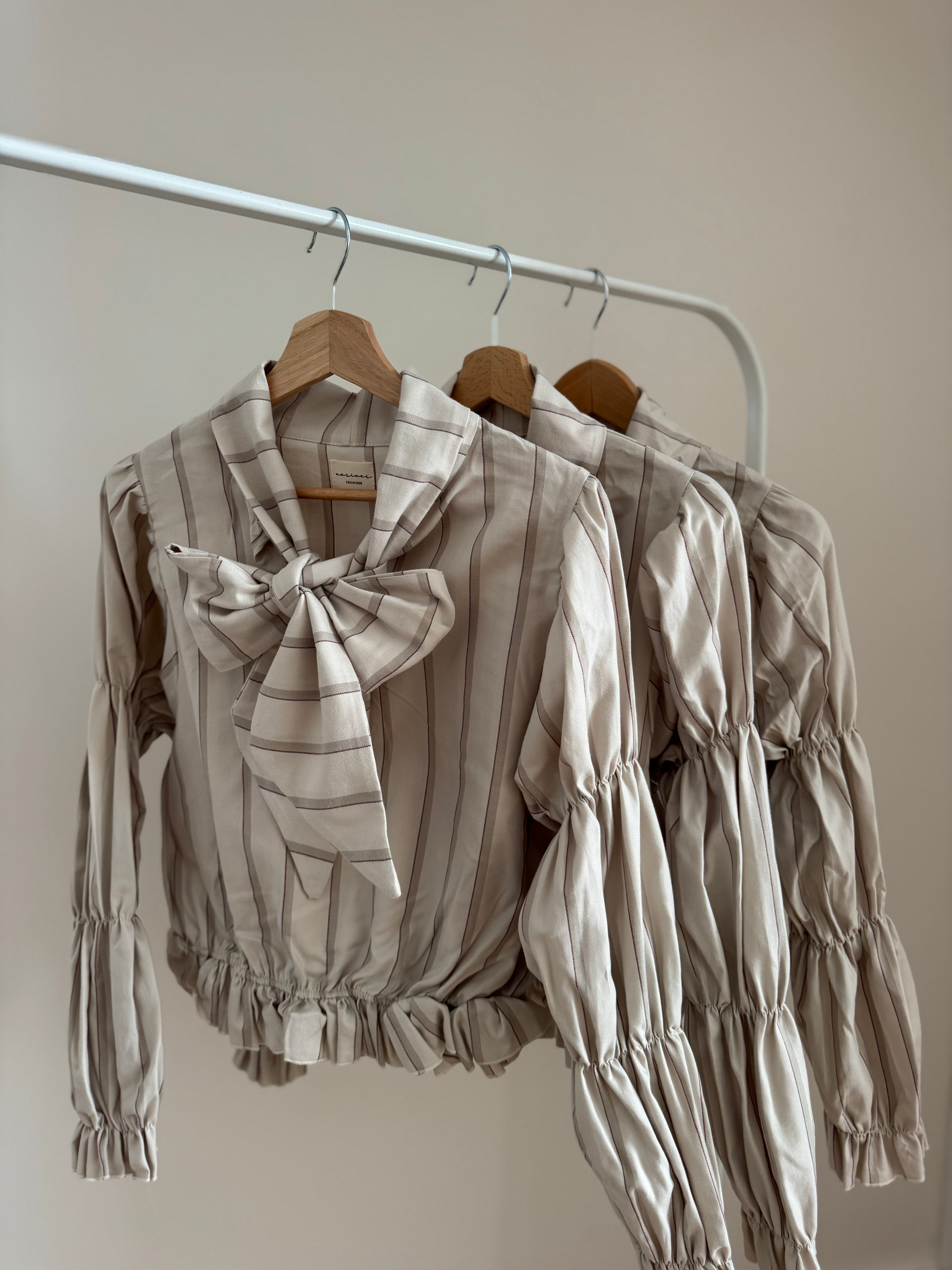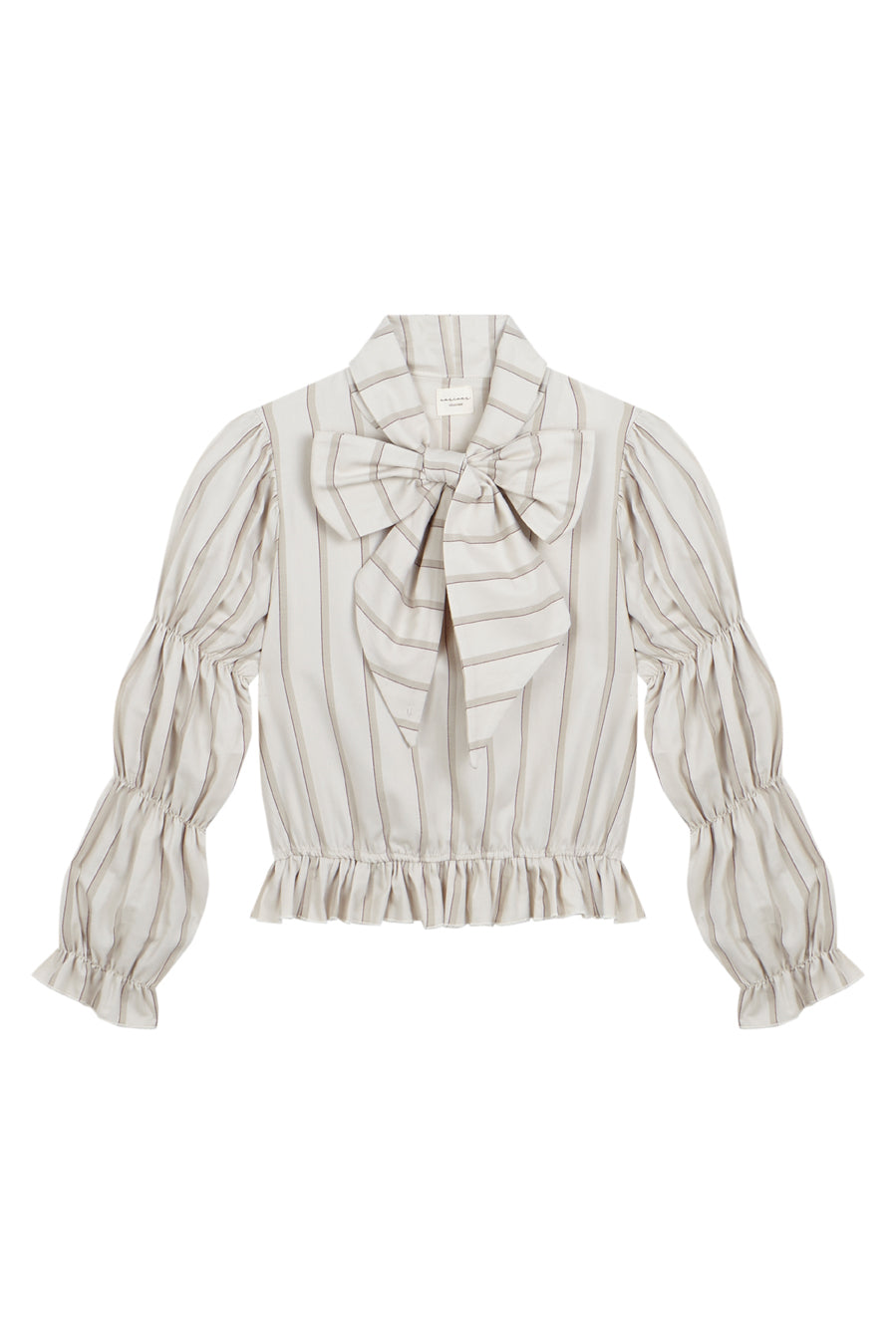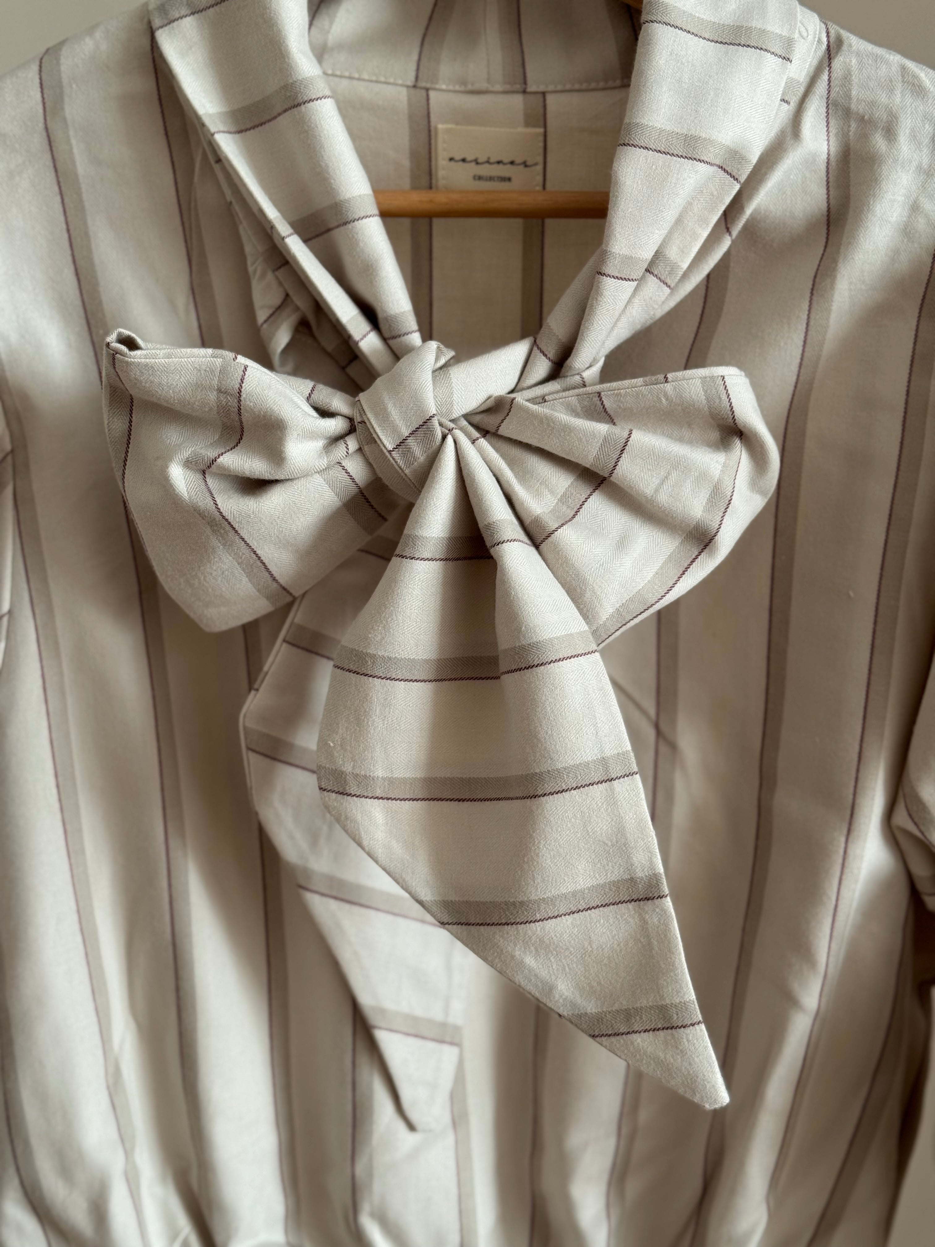 Blusa lazada en tejido 100% algodón en tonos crema. Cuello redondo y escote en pico con lazada en mismo tejido. Mangas abullonadas en tres partes y goma en la cintura.